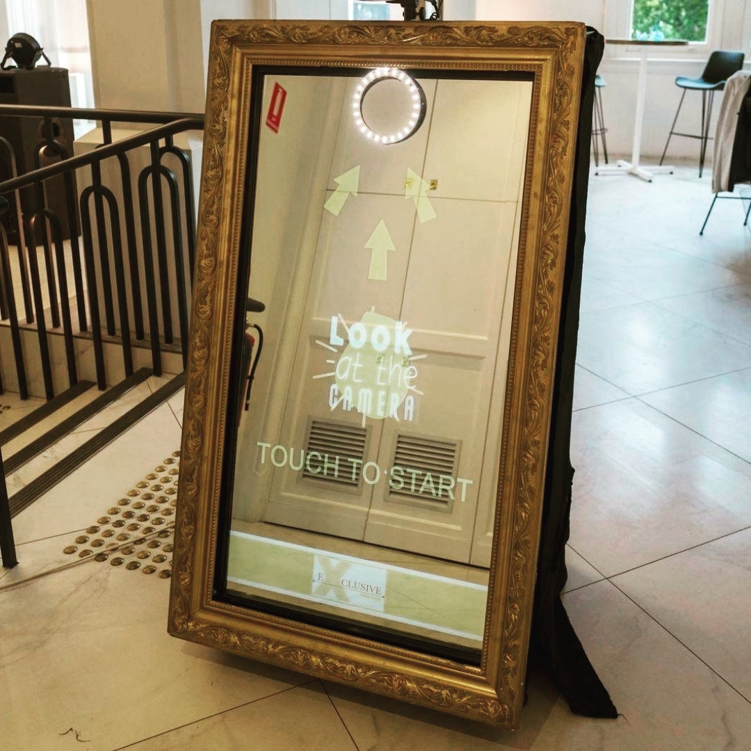 Mirror Me Booth is a unique and new photo booth experience. The full-length mirror offers a sleek design and a user-friendly touch screen interface. Equipped with voice guidance, a camera and software allowing you to take pictures through a mirror and share them on social media instantly.